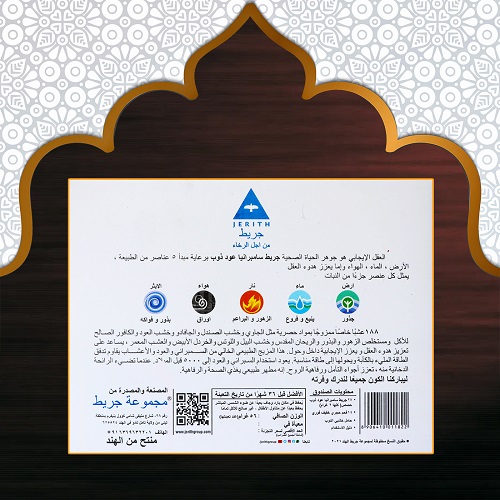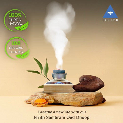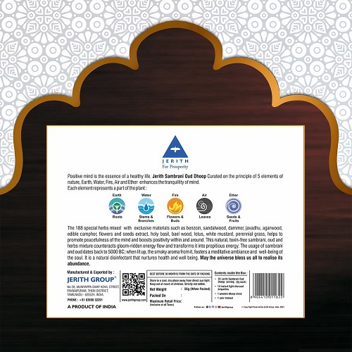 Positive mind is the essence of a healthy life. Jerith Sambrani Oud Dhoop Curated on the principle of 5 elements of nature, Earth, Water, Fire, Air and Ether enhances the tranquillity of mind.